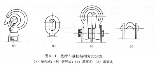 按滑車懸掛結(jié)構(gòu)方式(或稱連接方式)分為吊鉤式、鏈環(huán)式、吊環(huán)式和吊梁式4種,如圖4—1所示。