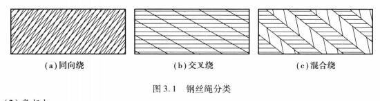 鋼絲繩是結(jié)構(gòu)安裝工程中常用的繩索,具有強度高、韌性好、耐磨性好等優(yōu)點。常用的剛繩中六股鋼絲和一股繩芯捻成。按搓捻的方式,分為同向繞、交叉繞、混合繞,如圖3.1所示。