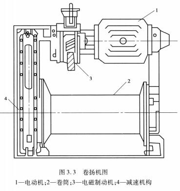 卷揚機又稱絞車,在結(jié)構(gòu)吊裝中是最常見的工具。它主要由電動機、電磁電筒制動器和減速機構(gòu)等組成,如圖3.2和圖3.3所示。