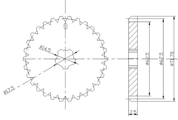 根據(jù)手拉葫蘆傳動(dòng)齒輪低速重載,根據(jù)手拉葫蘆傳動(dòng)機(jī)構(gòu)的原理由五齒長(zhǎng)軸的小齒輪帶動(dòng)片齒輪甲、乙的,考慮到無齒長(zhǎng)軸的小齒輪齒數(shù)甚小鄧特點(diǎn)。手拉葫蘆選用了齒形角20°的漸開線特種片齒輪變位齒輪,其基本齒形的基本參數(shù)如圖所示。選用齒形是考慮了以下因素:葫蘆傳動(dòng)齒輪的小齒輪數(shù)甚少為了避免根切和增強(qiáng)度,只能用正變位切削這樣小齒輪的外圓是受齒輪條的正切力,片齒輪與短軸屬于過硬配合,片齒輪的中心要設(shè)計(jì)出短軸尺寸屬過硬配合的小花鍵孔尺寸如圖所示: