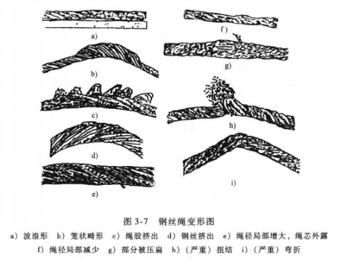 9)彎折(見圖3-7i),這是鋼絲繩在外界影響下引起的角度變形,有這種變形的鋼絲繩應(yīng)報(bào)廢。