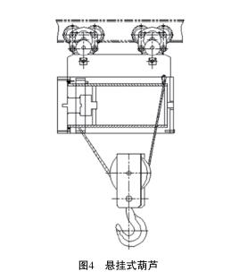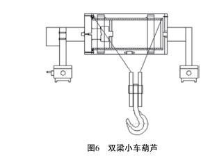 三合一內(nèi)平動卷筒作為緊湊型起升機構(gòu)驅(qū)動裝置,可以替換目前的電動葫蘆卷筒,形成各種各樣的電動葫蘆。如圖4所示,與普通的CD型鋼絲繩電動葫蘆的運行小車一起組成懸掛式電動葫蘆,如圖5所示,構(gòu)成低凈空鋼絲電動葫蘆,圖6是雙梁小車式鋼絲繩電動葫蘆。