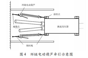 電動葫蘆根據(jù)牽引材料不同分為鋼絲繩和環(huán)鏈電動葫蘆,在同等規(guī)格條件下,環(huán)鏈電動葫蘆在運行距離、使用壽命、定位精度等方面均具有優(yōu)勢。為確保換流變平穩(wěn)牽引,采用兩臺環(huán)鏈電動葫蘆同步牽引,用牽引鋼絲繩、卸扣以及環(huán)鏈電動葫蘆將換流變與地錨連接在一起,如圖4所示。