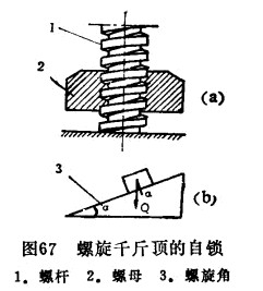 ? 當螺旋角大于摩擦角(即α>φ)時,被頂起的重物在自重作用下,自動產(chǎn)生下滑的現(xiàn)象,成為自落。LQ—50型螺旋千斤頂采用梯形雙線螺桿,其螺旋角大于摩擦角,這種螺旋千斤頂則具有自落能力。故重物被頂升后,需要停止時,另設(shè)有制動裝置。