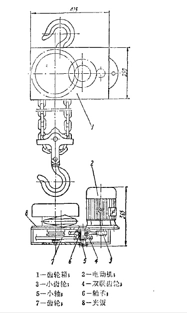 ? 某些場合因為三噸手動葫蘆操作速度低、勞動強(qiáng)度較大,所以在原有墓礎(chǔ)上,將手動葫蘆改為電機(jī)齒輪傳動,來提高丁生產(chǎn)效率,滿足了生產(chǎn)要求。具體的改裝示意圖如圖1。將原來手動葫蘆的鏈條和手鏈輪拆除,在夾板8上用螺釘固定齒輪箱1,1.1千瓦電動機(jī)固定在齒輪箱上。通過小齒輪3和雙聯(lián)齒輪4,傳到與手拉葫蘆主軸用三頭螺紋聯(lián)接的齒輪7上。操縱電機(jī)的反正轉(zhuǎn),即可平穩(wěn)地提取或放下重物。