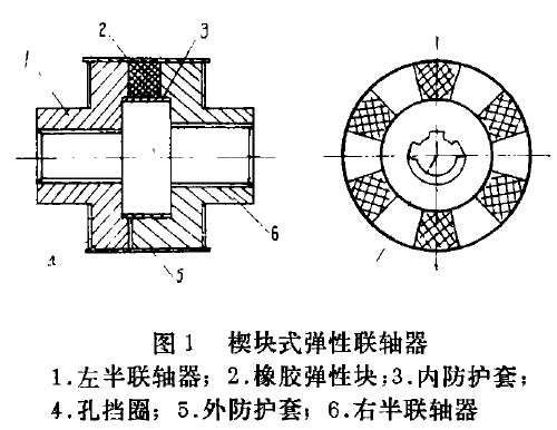 HC16型鋼絲繩電動葫蘆總體結(jié)構(gòu)型式為減速器→卷筒裝置→電動機,成同軸線布置。這種布置具有分組性好、外形勻稱、安裝方便、制造容易等特點。為了改善這種布置型式存在的電機軸與減速器輸人軸聯(lián)接上的薄弱環(huán)節(jié),將減速器及電機從卷筒裝置兩端適當(dāng)伸向卷筒內(nèi)腔,縮短兩軸間的聯(lián)接長度。并采用楔塊式彈性聯(lián)軸器聯(lián)接,如圖1。