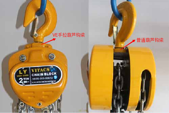 VE型手拉葫蘆具有雙保險,即有2個制動,2個棘爪,手拉鏈條不易脫落。而普通手拉葫蘆只有一個制動。