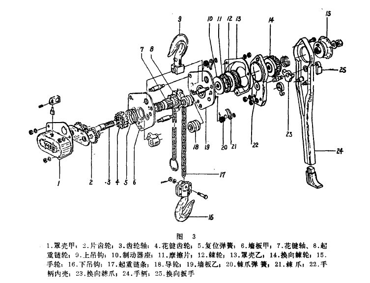 二級(jí)同軸式齒輪傳動(dòng)的環(huán)鏈?zhǔn)职夂J,如采用棘爪脫離棘輪嚙合的離合裝置,手拽動(dòng)鏈條時(shí)由于要帶動(dòng)兩級(jí)齒輪轉(zhuǎn)動(dòng),非常費(fèi)力,一般不采用。目前為常用的是齒輪軸脫開第一級(jí)齒輪嚙合或鏈條軸輪脫開第二級(jí)齒輪嚙合兩種型式。復(fù)位時(shí)均利用彈簧的彈力。這些離合裝置一般都有保險(xiǎn)裝置,防止操作時(shí)誤將離合裝置打開造成事故。